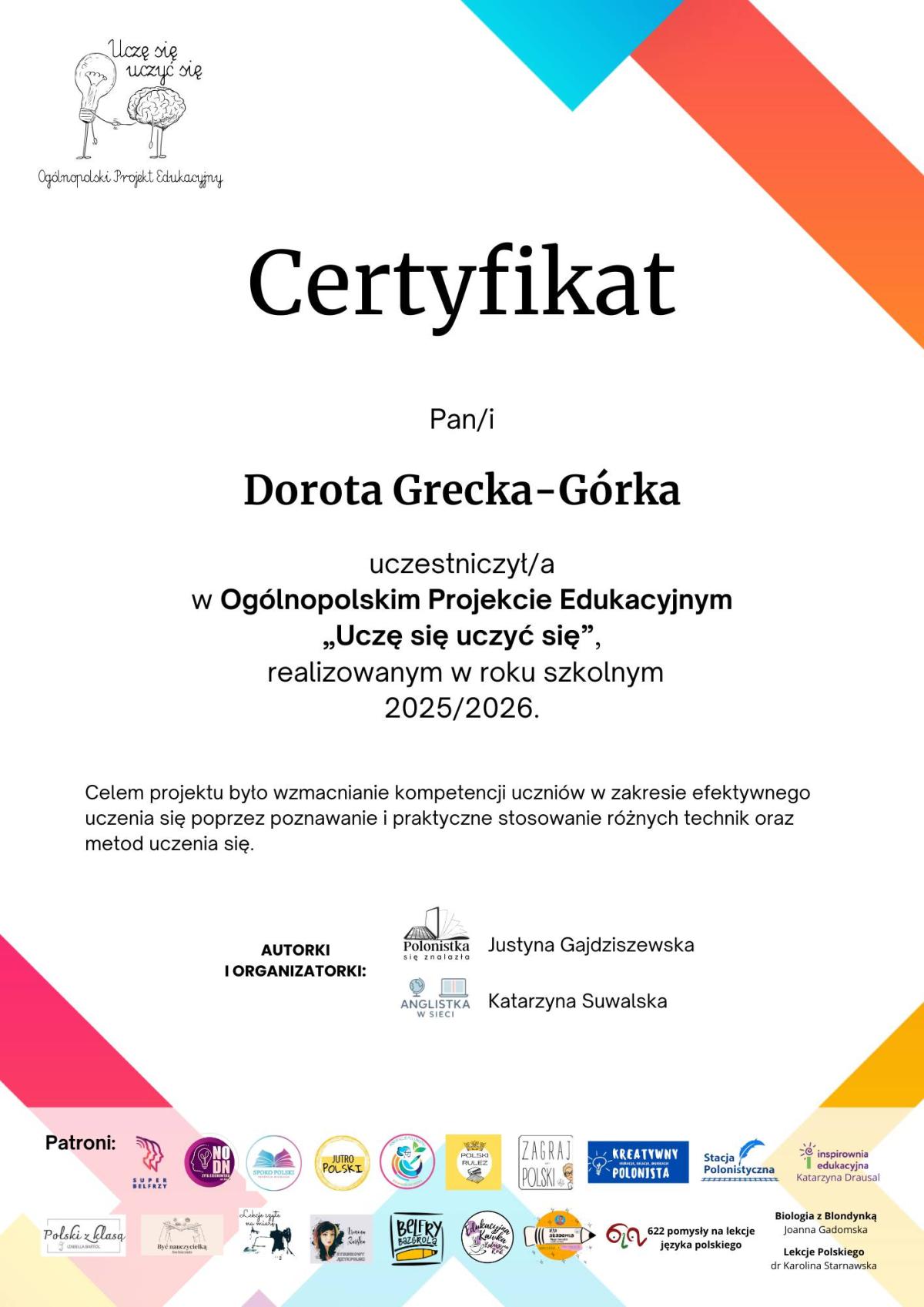 Klasa VII wraz ze swoją wychowawczynią zakończyła udział w projekcie edukacyjnym „Uczę się uczyć się”. Przez 12 inspirujących lekcji uczniowie poznawali różnorodne techniki skutecznego uczenia się, które pomogą im nie tylko w szkole, ale także w dalszej edukacji i codziennym życiu.